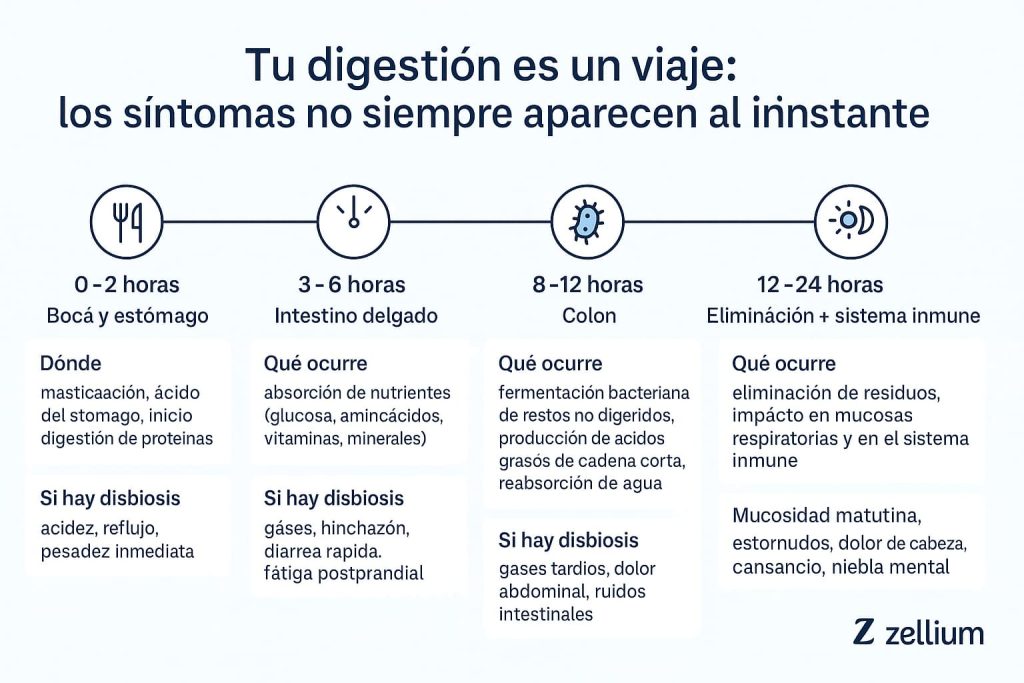 Los síntomas digestivos no siempre son inmediatos. En muchas personas con disbiosis, intolerancias o mucosa intestinal sensible, las reacciones aparecen horas más tarde o incluso al día siguiente, cuando el colon y la microbiota terminan de trabajar.